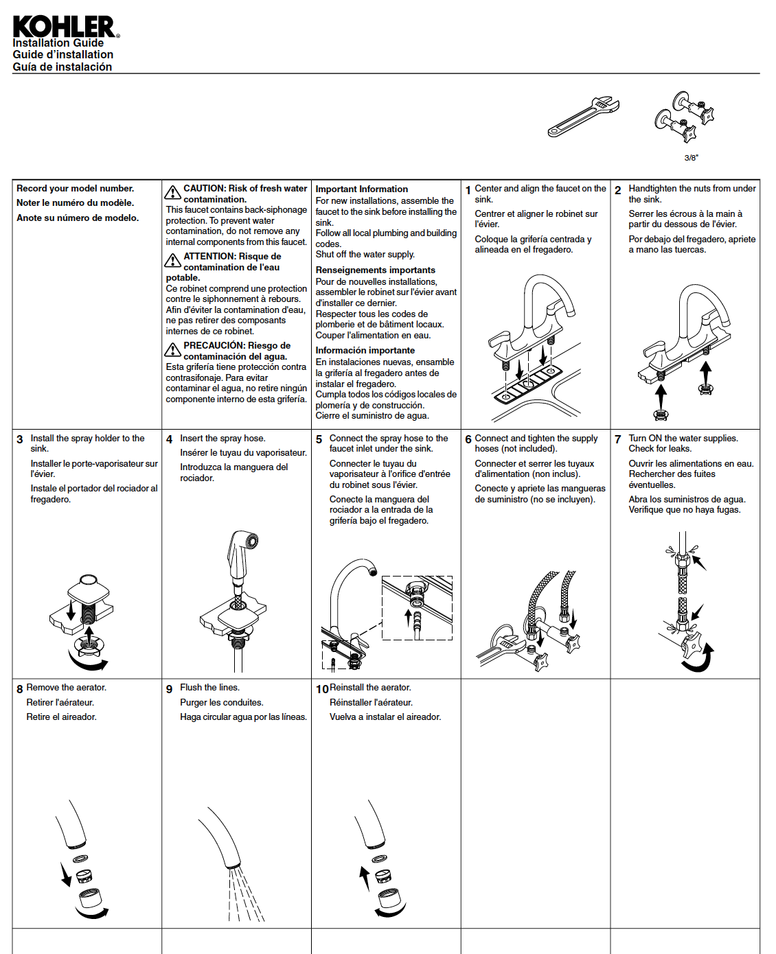 I worked on many installation instruction documents during my time at Kohler, but this document was one that I worked on almost completely on my own. This kitchen faucet was a completely new product for Kohler. It was my job to meet with the engineers to understand how the faucet is installed, collaborate with illustrators to create the art, and then write the copy for Kohler's audience.