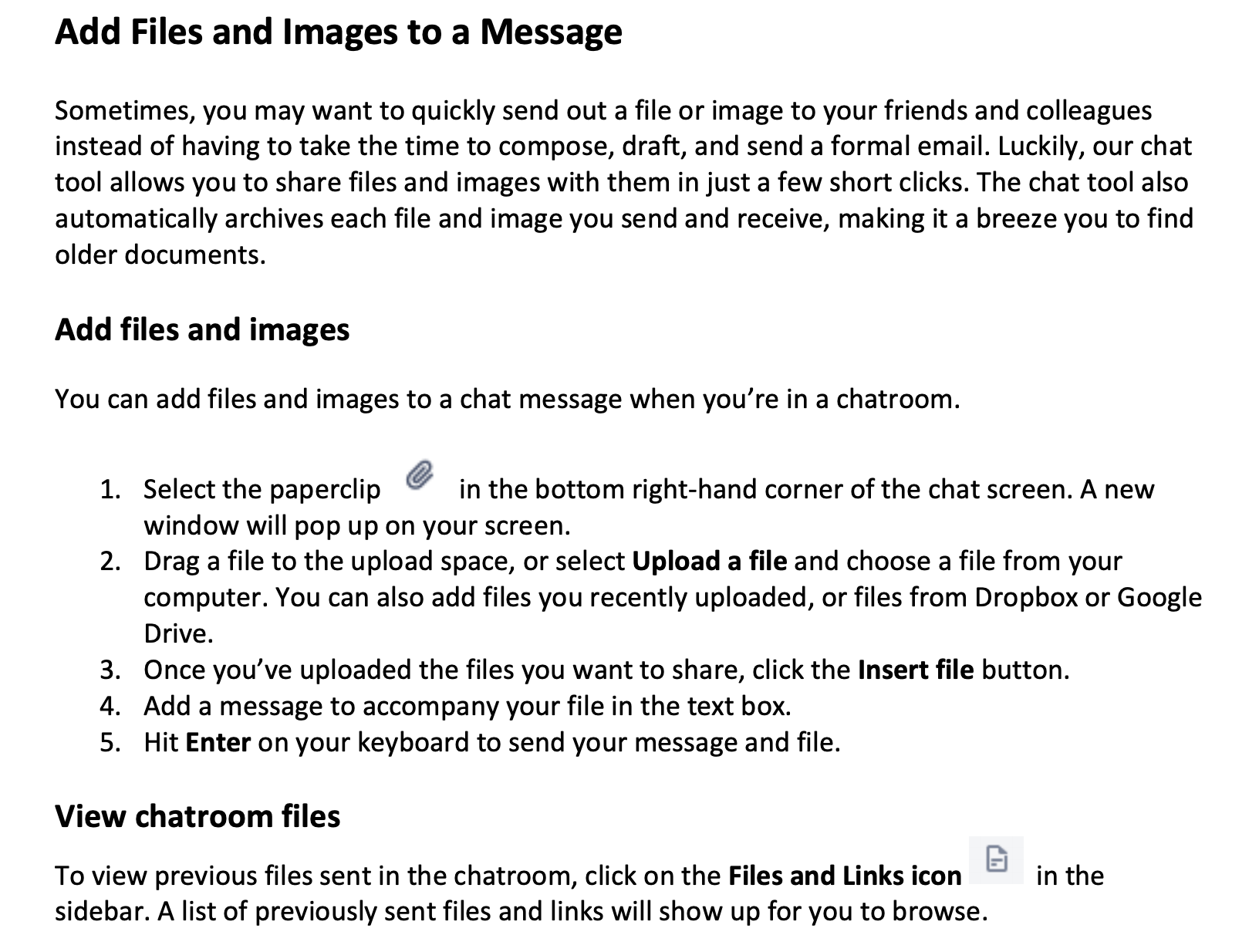 For a writing internship that I applied for, I was asked to write a short how-to document on adding files and images to a chat message. I was given five screenshots that showed me how to complete the task, and then I wrote the documentation keeping the company's voice, tone, and style in mind.